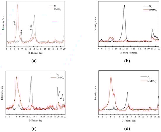The kaolinite group includes kaolinite and halloysite, with halloysite being subdivided into 7 Å halloysite and 10 Å halloysite. At room temperature, 10 Å halloysite easily loses part of the interlayer, and hydrates and transforms into 7 Å halloysite. To accurately calculate the relative content of kaolinite and halloysite, the natural slice can be saturated with dimethyl sulfoxide (DMSO). DMSO can enter the 7 Å halloysite layer structure and form an intercalation complex, so that the (001) layer spacing swelling occurs while the kaolinite layer structure is kept intact [17,26]. The XRD patterns of the DMSO slice are shown in Figure 9.