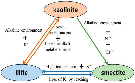 It can be seen from Table 3 that the main clay minerals in the ore sample were halloysite and kaolinite, followed by illite and smectite, accounting for 67.39%, 20.05%, 10.64%, and 1.92%, respectively. Under the action of different leaching agents, the relative content of clay minerals changed to some extent, especially illite. Under the action of leaching, the transformation of the 2:1 type illite was the easiest. The continuous loss of K+ in the illite crystal layer leads to illite evolving to montmorillonite. Meanwhile, when the alkali metal was removed in large quantities, the illite evolved further to form kaolinite [34]. This process is illustrated in Figure 10 [35]. It can be seen from Table 3 that the relative contents of kaolinite and smectite increased after the leaching process of the three ammonium salts, while the relative contents of illite decreased. When ammonium acetate was used as the leaching agent, the relative conversion rate of illite was 1.49% and that of smectite was only 0.17%. This also verified that the swelling ratio of clay minerals under the action of ammonium acetate was minimal.