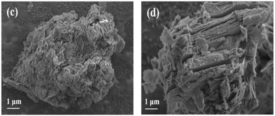 It can be seen from Figure 11 that the surface morphology of clay minerals changed to a certain extent under the influence of the three leaching agents. As can be seen from Figure 11b, a certain degree of dissolution and transformation occurred in the clay minerals after the action of ammonium chloride. The surface morphology of clay minerals was eroded seriously, the layered structure of clay minerals was partially destroyed, and the clay mineral particles fell off along the layered structure. Therefore, there was a large number of interlayer ions released into the solution during the rare earth leaching process. As can be seen from Figure 11c, the clay minerals after ammonium sulfate leaching also showed a serious erosion phenomenon. However, the layered structure of the clay minerals only showed an obvious swelling phenomenon; the dissolution and detachment of the clay minerals were not obvious. It can be seen from Figure 11d that the clay minerals after ammonium acetate leaching also had a certain erosion phenomenon, but the layered structure of the clay minerals was relatively complete. Meanwhile, fine particles were observed adsorbed on the edge of the crystalline layer structure of the clay minerals [36], which prevented the water molecules from entering the interlayer of the clay minerals, reducing the swelling of the clay minerals. Therefore, ammonium acetate had little effect on the swelling, dissolution, and transformation of clay minerals during the rare earth leaching process.