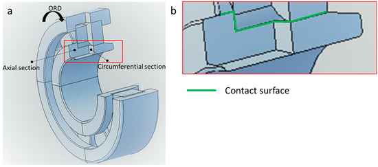 (a) Schematic drawing of the bearing and indication of the cross-section planes. (b) The green line represents the contact surface. The samples in the loaded zone were observed up to 1 mm from the contact surface. Distances further than 3 mm from the raceway surface were referred to as a non-loaded zone in this study.
