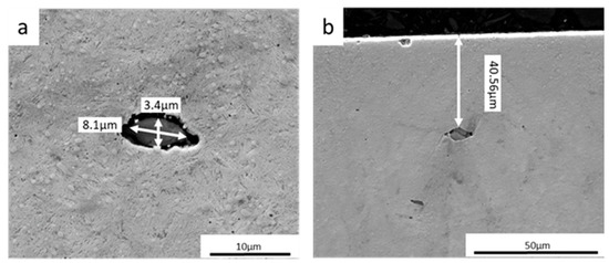 The microstructural observation that proves the proposed formation mechanism of the crack initiation in the bulk material is shown in Figure 13. The debonded inclusion is located in the loaded zone (up to 1 mm from the raceway surface). As the rolling cycles occur, local stress concentration develops around the debonded area, as shown in Figure 13a. Over successive rolling cycles, the stress levels increase, resulting in the formation of voids (regions with white arrows in Figure 13). These voids serve as regions of local high-stress concentration, which eventually develop microcracks into bulk material as means of stress relief. Figure 13b shows an inclusion with a fully developed butterfly wing on the right-hand side, while the left side only has a small indication of the crack in the bulk material.