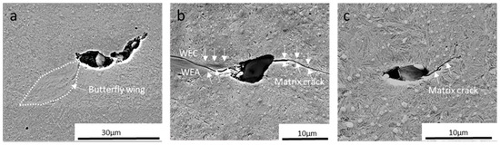 SEM–SE images of different types of damage observed in this study. (a) Appearance of butterfly wings. (b) White etching crack and white etching area. Arrows in the upper part point to the WEC, and arrows in the lower part indicate the WEA and (c) matrix crack.