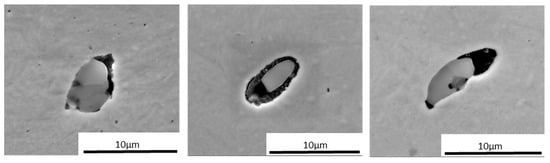 Considering debonding as an important factor, all inclusions in the loaded zone were analyzed, and it was found that most of the inclusions (85%) in the loaded zone were detached from the steel matrix. The investigation of the inclusions in the non-loaded zone suggests that the load is not responsible for the debonding. This is most likely due to the different thermal expansion coefficients and/or strain incompatibilities being enhanced during the deformation processing. Moreover, the different thermal expansion coefficients of inclusions with the bulk material can result in the development of tensile and compressive residual stresses parallel to the normal inclusion–matrix interface. In addition, strain incompatibilities during the formation processing of the steel can result in the formation of cavities at the inclusion interface [42]. Given such a high number, it is suggested that size, shape, and chemical composition do not influence debonding of the inclusions.