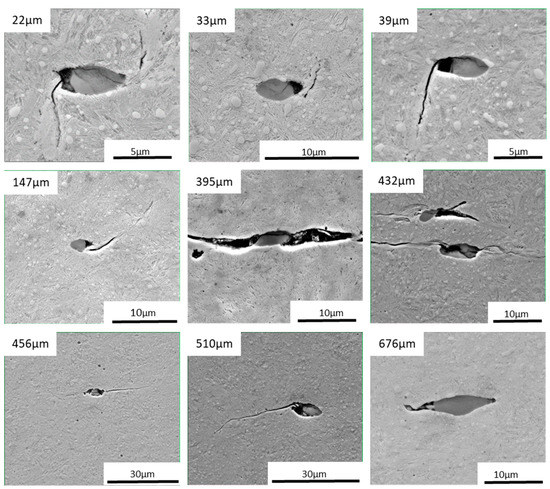 SEM–SE images of damage around inclusions in the loaded zone. The top-left number represents the distance from the raceway surface. The damage started on the side of the inclusion that was debonded from the bulk material. This is applicable for the wide range of distances (from 22 to 676 µm) from the raceway surface, suggesting that debonding plays a role in the entire loaded zone.