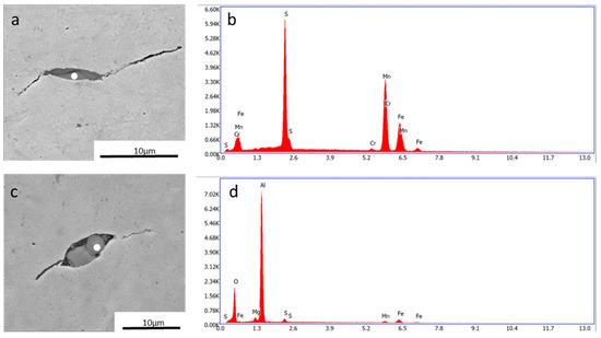 Types of inclusions present in this study. (a) SEM–SE figure of MnS inclusion; the white dot is where the spectra were taken. (b) EDS spectrum of the dot in (a). (c) MnS + Al2O3 inclusion type; this is also visible in the SEM figure, where contrast is present within different non-metallic compounds. (d) EDS spectrum of the white dot presented in (c).