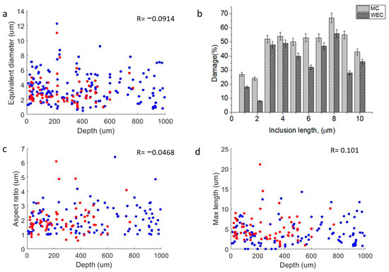 (a) Distribution of inclusion size across depth. (b) Percentage of initiated MCs/WECs in correspondence with inclusion length. (c) Maximum length of inclusions across depth. (d) Aspect ratio across the depth. Red represents inclusions that initiated damage, and blue indicates inclusions without damage.
