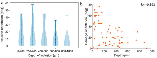 (a) Inclusion orientation across the depth. (b) Average angle of damage in relation to depth.