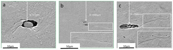 To illustrate potential damage orientations, examples of microstructural alteration are shown in Figure 10. A typical butterfly wing pattern of 45 degrees is depicted in Figure 10a, where both sides of the non-metallic inclusions developed BWs. The distance of this inclusion was very close to the raceway surface (22 µm); however, no connection of the crack to the surface was observed. Further away from the surface (345 µm), microstructural alterations propagate at shallower angles (cf. Figure 10b). Here, cracks also developed from both sides of the inclusions; cracks are longer than BWs, and the altered zone is broader in this zone. On the contrary, at distances greater than 500 µm, cracks were typically evolving from only one side of the inclusions, and a very thin WEA was observed around them (Figure 10c). These findings were consistent throughout this investigation and supported the hypothesis that WECs are an extension of BWs.