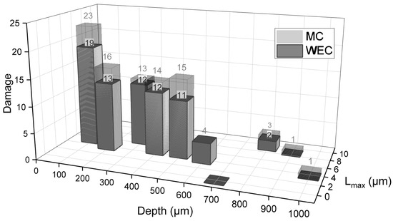 The non-metallic inclusion size is of primary importance concerning fatigue life. Neishi et al. [25] correlated MnS inclusion length with rolling contact fatigue (RCF) life, indicating that the reduction in inclusion length is one of the crucial factors to improve RCF life. To investigate what sizes of inclusions gave rise to a microstructural alteration in bearing steel, their length and width were measured, from which their equivalent diameter was derived. In addition, we analyzed the length of the non-metallic inclusions and the relation to damage initiation. Most inclusions fell into the range of 1–10 μm. This result shows that inclusions in the present study were, on average, smaller than those reported by other authors (8–16 µm and 5–30 µm, respectively) [21,23], while the dimensions fit with the observations in [24,26]. Figure 8 shows the depth versus size, aspect ratios, and max length of the inclusions; red dots are the inclusions that initiated damage, and blue inclusions are without damage. The equivalent diameter of the inclusions across depth suggests that they are randomly distributed throughout the sample (cf. Figure 8a). In Figure 8b, we observe the relationship between inclusion length and the percentage of initiated MCs and WECs. The damage percentage was determined by categorizing all non-metallic inclusions in the loaded zone based on their size per 1 micron, such as 0–1 micron intervals, 1–2 microns, 2–3 microns, and so on. Subsequently, the total number of non-metallic inclusions in the specific zone and the count of damage initiated by these inclusions were established. Inclusions measuring up to 2 μm exhibit a low probability of damage, less than 30%. However, as the inclusion length reaches 3 μm and beyond, there is a significant rise in damage initiation. The greatest percentages of damage occur at inclusion lengths of 8 μm, with 66% for MC and 56% for WEC. A similar observation as in Figure 8a is valid for the aspect ratio, maximum length of the inclusions (cf. Figure 8c), and maximum length across the depth of the sample (cf. Figure 8d).
