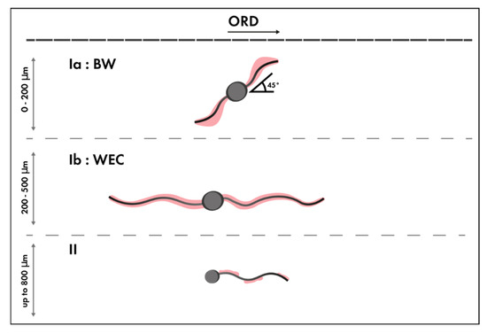 Comparing the microstructural alterations in different zones, earlier postulated mechanisms about crack rubbing and severe plastic deformation can be confirmed. A graphical representation of the proposed hypothesis is shown in Figure 14. In zone Ia, only individually present BWs were observed, which had a typical 45-degree propagation on either side of the non-metallic inclusion. In zone Ib of Figure 14, most of the WECs consisted of cracks propagating left and right from the non-metallic inclusions with a significantly thick WEA developed in the vicinity of the WEC. In zone II, most cracks appear only on one side of the non-metallic inclusions and the accompanying WEA was thinner than in zone Ib. These findings are in line with the previously proposed mechanism [35,52]. Indications of severe plastic deformation can be derived by comparing zones Ib and II. Zone II (where the stresses due to over-rolling contact are less pronounced) had a less deformed area around the WEC. Lower stresses mean that crack face rubbing is less intense; consequently, less WEAs are formed.