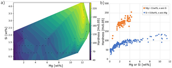 - At low levels of Mg, the effect of Si was neglectable on hardness, whereas at Mg levels of ~12 wt% a 2 wt%, the addition of Si increased the hardness by 40–50 Hv to reach values up to 240 Hv.