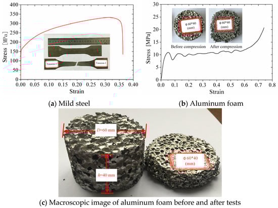 As shown in Figure 2, the engineering stress–strain curves of mild steel and aluminum foam were obtained from quasi-static tests. Table 1 and Table 2 present the properties of mild steel and aluminum foam.