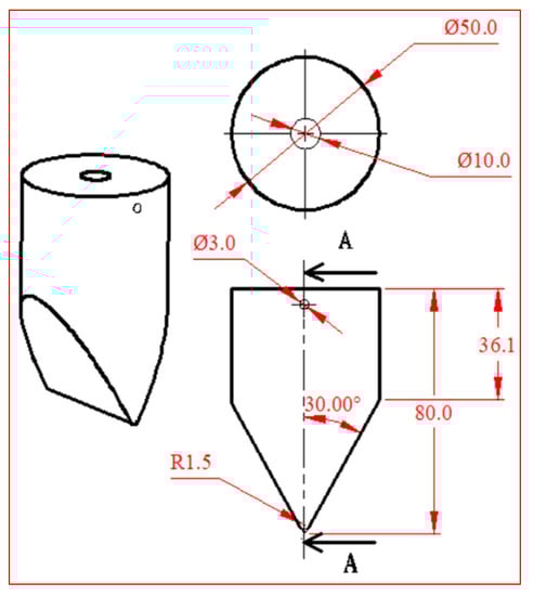 The impact tests were conducted using an INSTRON 9350 drop tower (ITW Ltd, Norwood, MA, USA) as depicted in Figure 3. The top of the additional mass frame was connected with a spring acceleration system, resulting in a maximum velocity of up to 24 m/s. Before the impact tests were conducted, the AFSB was clamped both ends with bolts to provide a fully clamped boundary condition, as illustrated in Figure 4. The impactor with a wedge nose (as presented in Figure 5) was connected with a force transducer, and the acquisition frequency used was 500 kHz. During the impact tests, all of the data were obtained from the force transducer via the data acquisition system (DAS 64 K). Thus, the time histories of velocity v(t), displacement D(t), and absorbed energy E(t) could be converted from the time history of the impact force, as described in Equations (1)–(3).