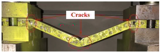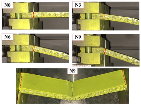 When the number of impacts reached a certain value, the AFSB failed, as shown in Figure 10. When sandwich beams are subjected to repeated impacts, several deformation modes can be observed, such as large inelastic deformation, core compression, and core shear with interfacial failure. As for the front and back face sheets, longitudinal stretching and plastic hinges at the boundary and middle span due to large plastic deformation are the main failure modes. However, no face wrinkling mode was observed in the impact tests, which is different from the phenomenon that occurred on a sandwich beam with a thin face and a strong core used in reference []. In contrast, the foam core failure mode was dominated by core compression, core tensile fracture, and core shear accompanied by interfacial delamination. As the sandwich beam underwent bending deformation, the foam core experienced global bending and longitudinal stretching, leading to tensile fracture at the support and the middle span. Since the strength of the adhesive layer was lower than that of the core shear strength, when large plastic deformation occurred, delamination appeared between the face sheet and the foam core.