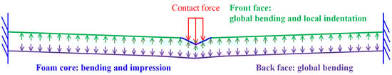 Compared with the aluminum foam core, the face sheet was relatively stronger. Therefore, the foam core was easily compressed along the direction of the thickness. To explain the deformation pattern of the AFSB, the loading state of the AFSB subjected to a wedge mass impact is presented in Figure 7. Under a wedge mass impact, the front face is subjected to a concentrated force from the impactor and the loading area is adjacent to the middle span of the beam. Owing to the concentrated force, the front face sheet will bend, resulting in the overall compression of the foam core. Accordingly, the foam core provides support to the front face and compression to the back face. Therefore, the front face sheet is subjected to concentrated force and distributed pressure, the back face sheet is mainly subjected to distributed pressure, while the foam core experiences distributed pressure from the front and back face sheets.