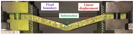 As discussed above, the loading state of the sandwich beam was decides by its deformation pattern. When subjected to impact loadings, the AFSB not only experienced global bending but also local indentation, as presented in Figure 8. In addition, the front face sheet underwent global bending and local indentation. In our experiment, two plastic hinges adjacent to the indentation were observed. Meanwhile, the back face sheet experienced global bending, while the foam core presented global bending and compression accompanied by local indentation. In addition, plastic hinges occurred at the middle span and the boundary and the displacement was almost linearly distributed from the middle span to the clamped boundary.