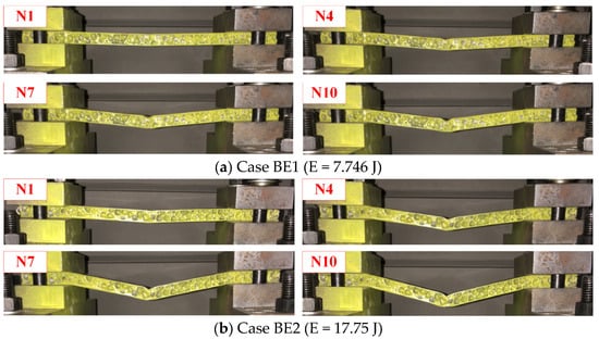 As for case BE1 (E = 7.746 J) and case BE2 (E = 17.75 J), their initial impact energy was less than 20 J; the impact test was repeated 10 times, and neither the face sheet nor the foam core experienced fracture on the 10th impact. The overall bending and local indentation of the AFSB increased with the number of impacts, due to the energy accumulated during the repeated impacts, as shown in Figure 9a,b. As for the overall deformation of the AFSB, the deformation profile exhibited excellent symmetry, the distribution of the displacement was approximately linear, and the plastic hinges were located at the middle span and the clamped boundary. With the increase in the number of impacts, small cracks began to appear at the plastic hinges of the sandwich beam and progressive failure occurred.