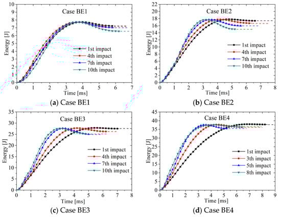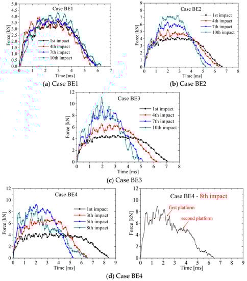Figure 11 displays the time history curves of the impact force. A force platform appeared in all instances (irrespective of the number of impacts) due to the compression of the aluminum foam core during impact. As for case BE1 and case BE2, the peak value of the impact force increased with an increase in the number of impacts. For case BE3 and case BE4, the metal foam core cracked on the 7th impact and the 5th impact, respectively, as shown in Figure 9; as a result of the cracked core, the loading capacity of the AFSB decreased rapidly. Therefore, after a certain number of impacts, the AFSB cracked, and the peak value of the impact force began to decline.