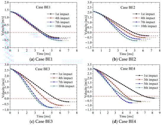 In case BE1 and case BE2, the rebound velocity increased with an increase in the number of impacts, as shown in Figure 12a,b. However, when the metal foam core experienced fracture, the rebound velocity decreased, as shown in Figure 12c,d, and the corresponding cases were the 10th impact for case BE3, and the 8th impact for case BE4.