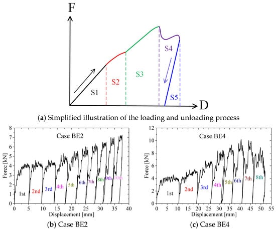 As for a lower impact energy, such as in cases BE1 and BE2, no fracture was observed on the front face sheet and the foam core, leading to the elimination of stage 4 (S4), as plotted in Figure 14b. In contrast, for higher impact energy, such as in cases BE3 and BE4, the front face sheet and the foam core experienced fracture, leading to the occurrence of all five stages, as presented in Figure 14c.