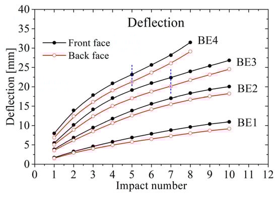As for repeated impacts, the impact energy accumulated with increasing numbers. As seen from Figure 15, as the number of impacts increased, the permanent deflections of the face sheets increased, while the increments declined. When the metal foam core fractured, the carrying capacity of the AFSB decreased suddenly, resulting in an increase in the amount of face sheet deflection.