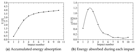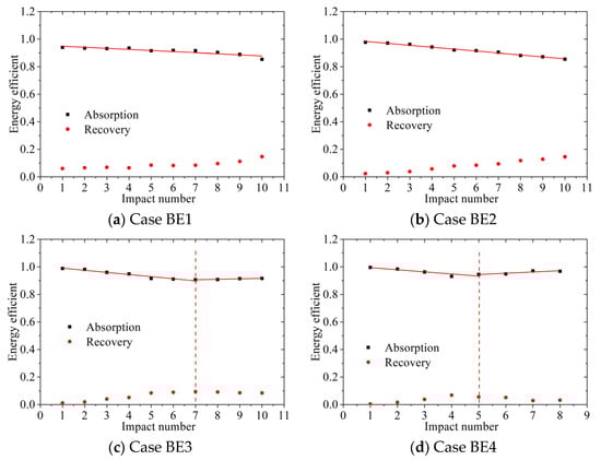Table 6 presents the data relevant to energy absorption. As shown in Figure 16, the energy absorption coefficient decreased with the number of impacts, while after the core fractured, the energy absorption coefficient began to increase. The correlation between the energy absorption efficient and the impact number was fitted linearly. As for case BE1 and case BE2, the metal foam core did not fracture, even on the 10th impact. Therefore, only one curve could be used to describe its characteristic energy absorption, as described in Equations (10) and (11). However, for case BE3 and case BE4, due to the fracture of the metal foam core, the curve had to be divided into two parts, which could be fitted as Equations (12) and (13).