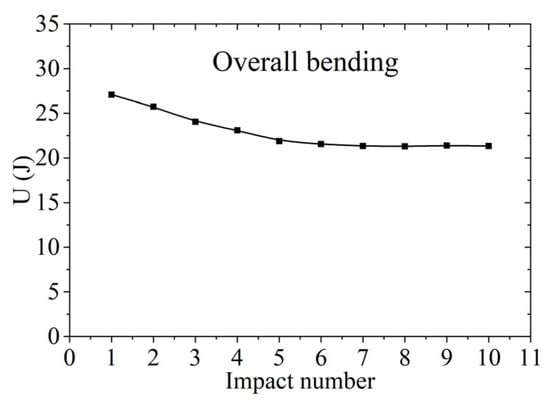 As the number of impacts increased, the energy absorbed due to local indentation during each impact (ΔUi) initially increased and then decreased, as illustrated in Figure 17a. When the impact number reached 7, ΔUi began to decrease as a result of the metal foam core reaching the densification stage. At this moment, the energy was mainly consumed via overall bending; subsequently, local indentation no longer increased. Correspondingly, as shown in Figure 18, the energy absorbed due to global bending under each impact decreased with the number of impacts, and the rate of change in energy absorption decreased. However, when the number of impacts was more than 7, the energy absorbed due to global bending remained almost constant.