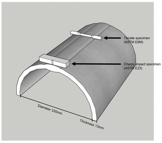 Locations of tensile and Charpy impact test specimens in the welded region of a submerged arc-welded high manganese steel pipe.