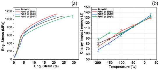 Figure 2a shows the engineering strain-stress curves of high manganese steel weld metal by different PWHT temperatures is plotted in Figure 2a. Tensile testing at cryogenic temperatures showed that the as-welded weld metal had a strength of 1079 MPa and an elongation of 24.6%. After PWHT at 600 °C or 750 °C, the tensile strength increased to 1134 and 1121 MPa, respectively, and elongation decreased by 21.5% and 21%. However, after PWHT at 900 °C, the tensile strength was 1089 MPa and the elongation was 29.4%, an increase of 4.8%. However, when PWHT was performed at 900 °C, the steel exhibited a strength of 1089 MPa and maintained an equivalent level of strength comparable to that before PWHT with 29.4% elongation, which was improved by 4.8% compared to before PWHT.