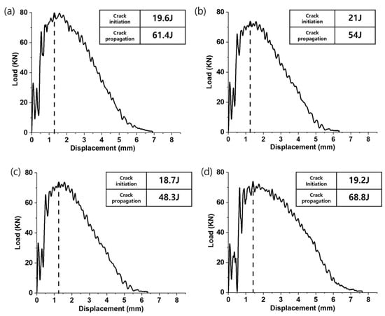 Instrumented Charpy impact test results for high manganese steel at different PWHT temperatures (a) As-welded, (b) PWHT at 600 °C, (c) PWHT at 750 °C, and (d) PWHT at 900 °C.