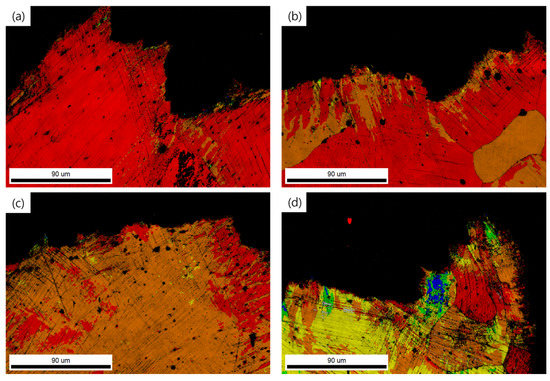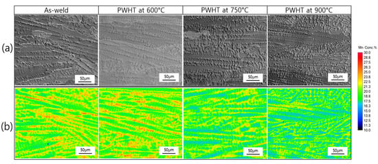 Figure 4b shows the EPMA analysis conducted to analyze the chemical composition and distribution differences between the inter-dendritic and dendritic regions. The average manganese content did not change drastically with the PWHT temperatures, which were (a) 17.6~24.2 wt.%, (b) 17~22.6 wt.%, (c) 17.7~24.3 wt.%, and (d) 16.6~21.3 wt.%. However, the deviation of manganese content in the inter-dendritic and dendritic regions decreased with increasing PWHT temperature, and manganese did not fully diffuse even at high PWHT temperatures due to its slow diffusion rate [25].