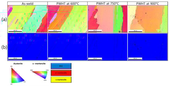 Figure 5 shows EBSD analysis of the high manganese steel before and after PWHT. High manganese steel has a high coefficient of thermal expansion and a lower thermal conductivity [18]. Therefore, high manganese steel is prone to internal thermal stresses during heat treatment compared to other types of steel. EBSD analysis was conducted to examine the effect of PWHT on the crystallographic orientation, as well as to determine the occurrence of deformation twinning, slip, and diffusionless transformation caused by thermal stress. Figure 5a shows the IPF map of the high manganese steel weld metal. The orientation of the inside of the grain before and after PWHT was the same and no twins or slips were observed. Previous studies have reported that partial recrystallization occurs in high manganese steel when annealed at 900 °C [26]. However, in this experiment, recrystallization did not occur despite PWHT up to 900 °C. The reason is that the driving force for recrystallization is low due to the low dislocation density inside the weld metal. However, the base metal exhibited a fully austenitic structure, and PWHT at 900, recrystallization occurred, resulting in an increase in grain size [27].