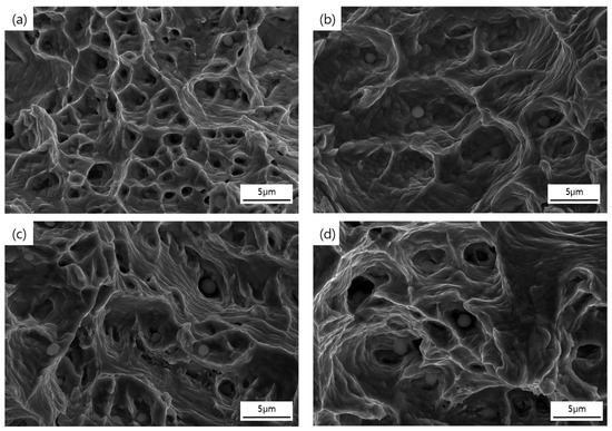 Fractography images of high manganese steel welded metal. (a) As-welded weld metal and after PWHT performed at (b) 600 °C, (c) 750 °C, and (d) 900 °C.