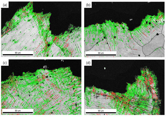 Figure 10 shows a fracture surface Schmid factor maps after cryogenic Charpy impact testing before and after PWHT. Sigma value = and the {111}<110> slip system has been identified as the easiest slip system to activate in FCC crystals. The Schmid factor Sigma value (σ) is an index that represents the orientation of a specific plane or direction with respect to the applied stress. Accordingly setting all plane indices and stress values to zero. After the Charpy impact test, the analysis of the fracture surface in terms of the Schmid factor involved setting all plane indices and stress values to zero. In FCC crystals, as the Schmid factor increases, twinning becomes the dominant deformation mechanism, while as the Schmid factor decreases, slip becomes the dominant deformation mechanism [43]. For the as-welded metal, since crystals with a high Schmid factor are mainly distributed, there is a higher possibility for twinning to be the dominant deformation mechanism and for stress to be dispersed within the crystals. However, as the PWHT temperature increases, a larger number of low Schmid factor crystals are distributed, leading to a decrease in the possibility of twinning as the major deformation mechanism.