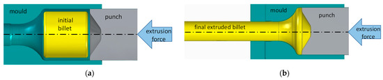 The studied extrusion setup consists of three main parts, i.e., a mould, a punch and a processed material (billet), as illustrated in Figure 1. According to this figure, the billet shows a cylindrical shape at the beginning of the extrusion process (a), to turn into a nail-like shape at the end (b). It is important to point out that the billet initial diameter is slightly smaller than that of the accommodating mold. This implies that the punch compression against the billet produces a radial expansion of the billet in the initial stage of the process. At the stage when the material can no longer radially expand, then the material flows through the narrower section of the mold. The punch arrests prior to reaching its mechanical travel stop in order to obtain the head of the extruded piece.