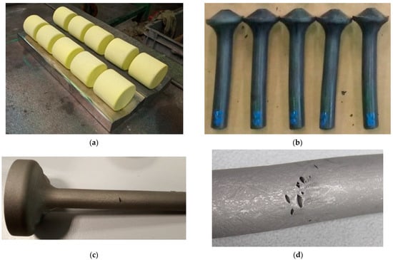 Set of glass-coated billets (a) ready for the extrusion test and (b) after the test. Surface crack formation after preliminary tests (c) and close up view (d) of the damaged zone.