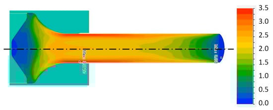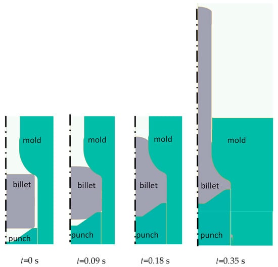 Thanks to the numerical simulation of the hot extrusion process, it is possible to graphically distinguish three phases of the process (see Figure 4), referring to an extrusion speed v = 0.67vmax. At t = 0, the punch touches the billet, producing its radial expansion up to t = 0.09 s. After that time, the material starts flowing inside the matrix up to t = 0.18 s. During this phase, the high friction between the billet and the mold produces heat and, consequently, a significant increase in the temperature of the billet. From t = 0.18 s up to the end of the process (t = 0.35 s), the billet shows its final forms and starts flowing more freely.