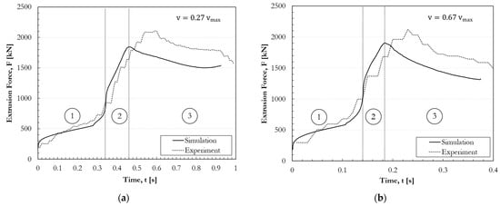 Extrusion force versus time for (a) an extrusion speed of 0.27vmax and (b) of 0.67vmax.