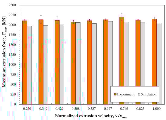 Maximum extrusion force for different extrusion speed: simulated and experimentally measured results.