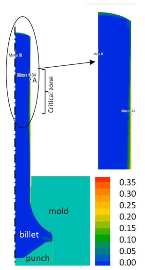 For the sake of illustrating a significant full-field distribution of the damage parameter D over the analyzed domain, we decided to choose the following process parameters: Tb = 1090 °C and v = 0.67vmax. Following this, Figure 8 shows the result of this analysis. It can be observed that the most critical values occur over the surface of the upper part of the extruded workpiece (maximum value of D at the point labelled as “A”). In this zone, the risk of surface crack formation is higher than that of the remaining regions of the model. Although the damage parameter does not provide a quantitative evaluation of the crack formation condition, the proposed model is certainly capable of identifying the most critical regions, as verified by the preliminary experimental tests conducted in this work (see Figure 2c,d). Therefore, D should be minimized as much as possible to avoid material cracking within the limits of the other technological constraints.