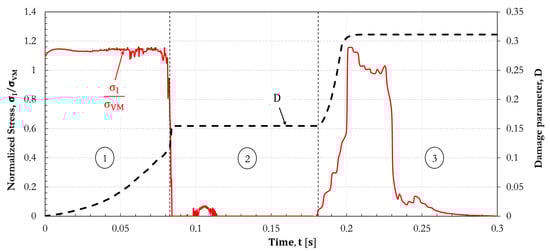 In order to better understand the obtained results, point “A” was monitored throughout the whole extrusion process to observe the evolution of the damage parameter D (see Figure 9). It can be observed that ~50% of damage D accumulates during the first extrusion step that involves the billet expanding radially (1). At t = 0.08 s, the radial expansion of the billet in the mold is concluded and point “A” is located by the entrance of the mold diameter reduction. From t = 0.08 s to t = 0.18 s, mostly the inner part of the billet material starts to flow within the smaller section of the mold (2). In fact, in this time interval, point “A” does not undergo major displacement and deformation, therefore the damage parameter D remains almost constant. At t = 0.18 s, the severe plastic deformation of the flowing billet starts also involving the external regions of the billet, which slides with respect to the mold wall, including point “A”. At t = 0.19 s, point “A” exits the mold and detaches from the mold wall (3). In this phase, a further increase in D occurs, mainly due to the positive stress in the axial direction induced by the friction forces and counterbalanced by the reaction of the mold. The evolution of the ratio is also reported to be made clear, according to the expression reported in Equation (5), when the increase in D is related to an increase in the strain rate (1).