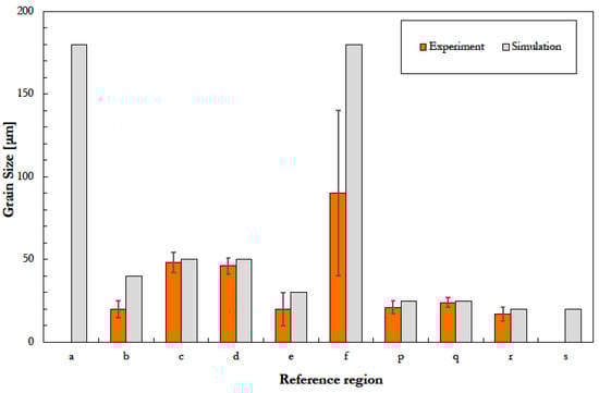 Grain size evaluation: experimentally measured vs. calculated. Labels refer to the regions listed in Figure 3. Note that regions (a) and (s) do not present a measured grain size.