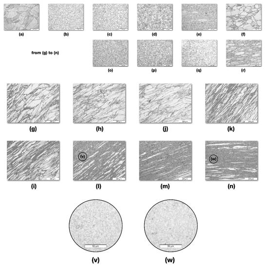 A graph that compares the calculated grain dimension and the measured grain size is shown in Figure 12. The graph confirms that the regions with a fully recrystallized grain show a good agreement as far as the grain size is concerned, between the values evaluated by using the numerical methods previously presented and the experimental observations. On the other hand, the same match could not be fully verified at the regions where partial recrystallization occurred. In this case, the differences are more related to the difficulty in measuring the grain size by image analysis (intercept method).