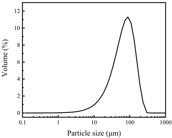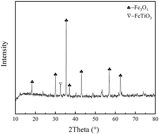 The main components of the iron concentrate are shown in Table 1, in which the Fe content was 52.00% and the V content was 0.31%. The physical phase analysis of the iron ore concentrate is shown in Figure 2; the iron ore concentrate was mainly composed of magnetite and ilmenite phases. Figure 3 shows that the particle size range of the iron ore concentrate was 0–300 μm, while the percentage of ore fines with particle size less than 74 μm was about 40.15%.
