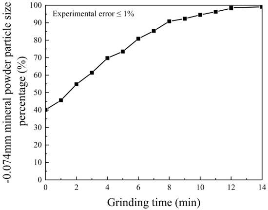 The iron ore concentrate was coarse and unsuitable for pelletizing. First, the effect of grinding time on the particle size percentage of −0.074 mm iron ore concentrate was investigated. Grinding reduced the solid particle size and increased the specific surface area of the particles, which promoted pellet formation. The grinding process also destroyed the structure of the ore powder, making the vanadium within it more susceptible to oxidation. Figure 4 shows that extending the grinding time produced a finer particle size of iron ore concentrate. A total of 90% of the iron ore concentrate powder particle size was less than 0.074 mm after 8 min of grinding. Further increasing the grinding time greatly reduced the grinding effect and also increased the energy consumption. Therefore, the grinding time was set to 8 min.
