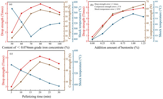 The effects of mineral powder −0.074 mm particle size ratio, bentonite addition, and pelletizing time on pellet performance were investigated, and the results are shown in Figure 5. We adjusted the addition amount of bentonite to 1% and the pelletizing time to 15 min.