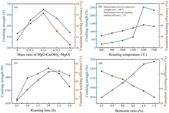 Influence of roasting conditions on compressive strength and vanadium leaching rate of pellets: (a) the effect of roasting, (b) the effect of roasting temperature, (c) the effect of roasting time, (d) the effect of bentonite ratio.