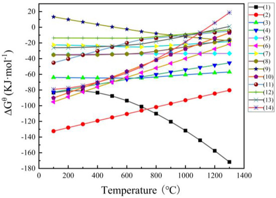 The reactions occurring in the pellets during roasting are shown in Equations (1)–(14). Figure 7 shows the Gibbs free energy of reactions (1)–(14) in the range of 100–1300 °C. The relevant data were calculated using HSC 6.0 software (Ottokump Research Center, Uusimaa, Finland). Reaction (9) shows the reaction equation for the thermal decomposition of calcium hydroxide, which displayed a negative Gibbs free energy at 500 °C, indicating that calcium hydroxide began to decompose and form calcium oxide. The other reactions showed negative Gibbs free energies in this temperature range, indicating that these reactions were thermodynamically feasible. Reactions (4), (6), and (11) show the conversion of V3+ to V5+, and reactions (3), (7), (8), and (12)–(14) show the reaction of vanadium pentoxide with calcium oxide and magnesium oxide to form calcium vanadate and magnesium vanadate. Reaction (5) shows the reaction of silicon dioxide with calcium oxide and magnesium oxide to form silicate, which is detrimental to the leaching of vanadium and should be avoided in the roasting process.