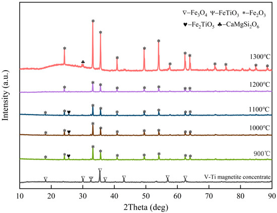 Figure 8 shows the XRD patterns of iron ore concentrate pellets after roasting at different temperatures, in which iron mainly existed as Fe3O4. After roasting, iron was oxidized, and divalent iron was transformed into trivalent iron. The diffraction peaks of Fe2TiO5 appeared, which is the product of the reaction between Fe2O3 and TiO2. When the roasting temperature reached 1300 °C, a diffraction peak of silicate appeared. This compound inhibited the consolidation of pellets and vanadium leaching.
