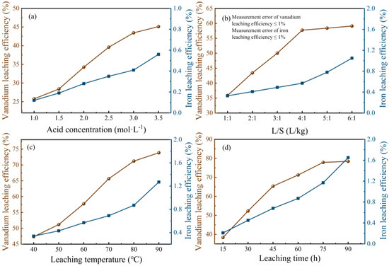 Influence of leaching conditions on leaching rate of iron vanadium: (a) the effect of acid concentration, (b) the effect of L/S, (c) the effect of leaching temperature, (d) the effect of leaching time.